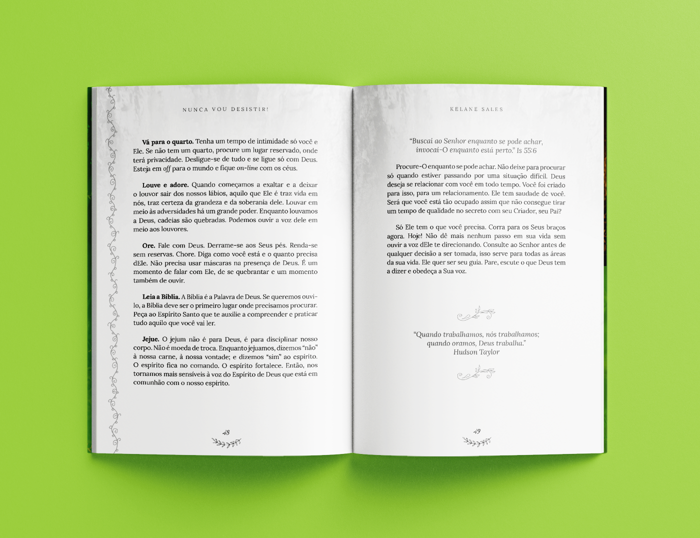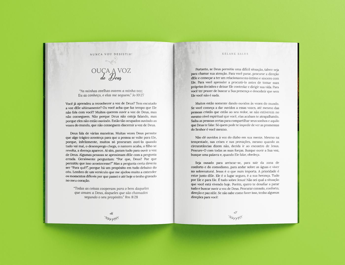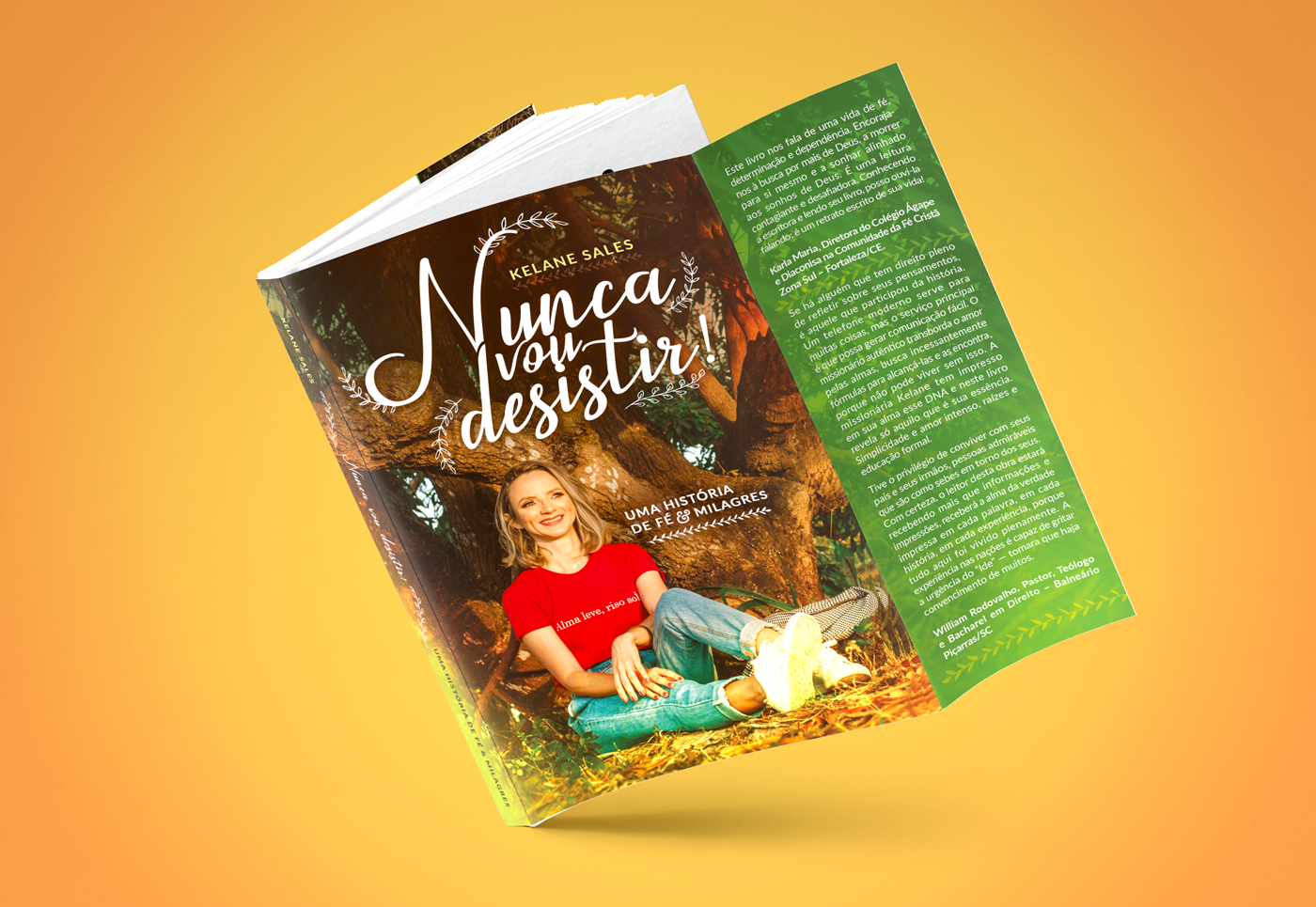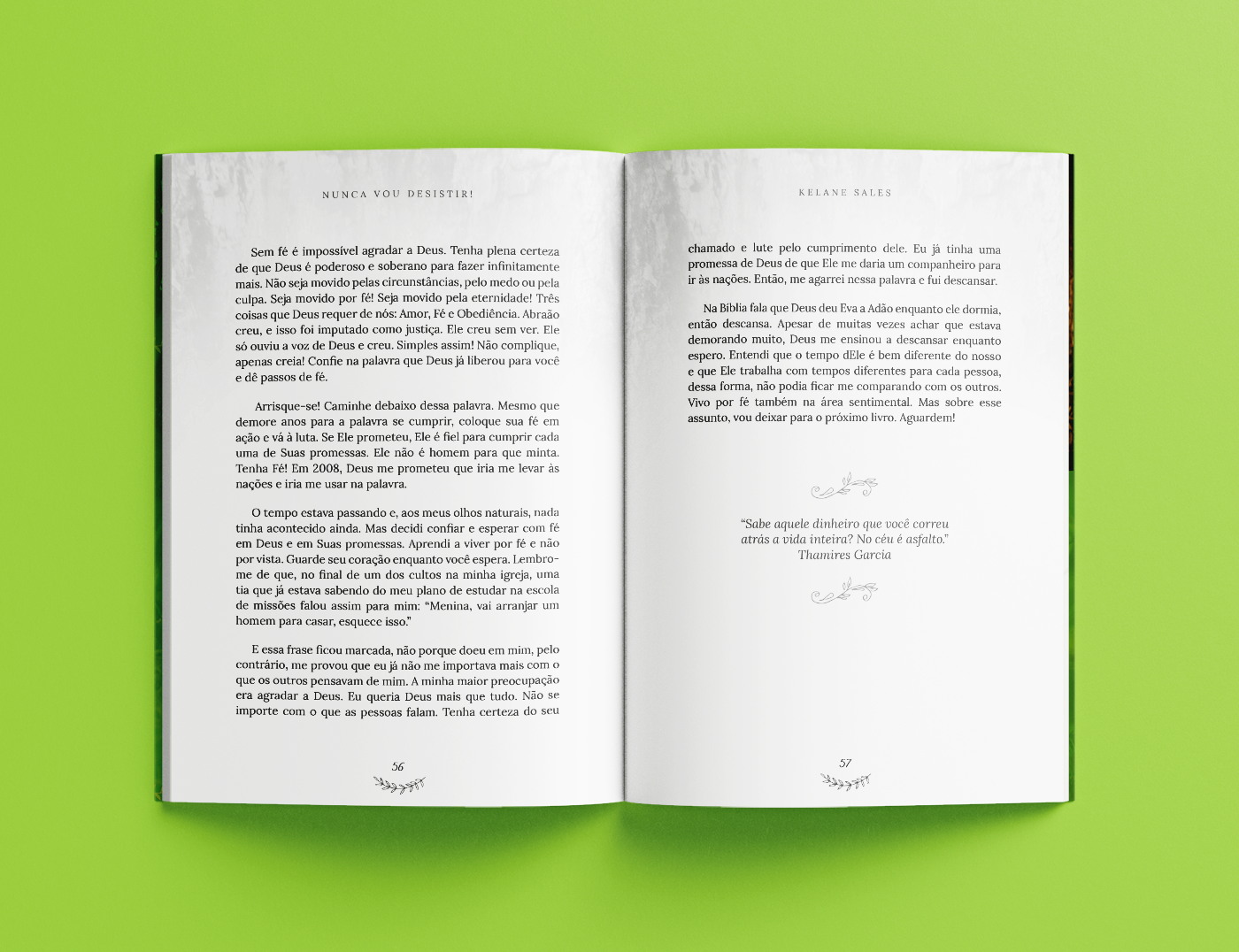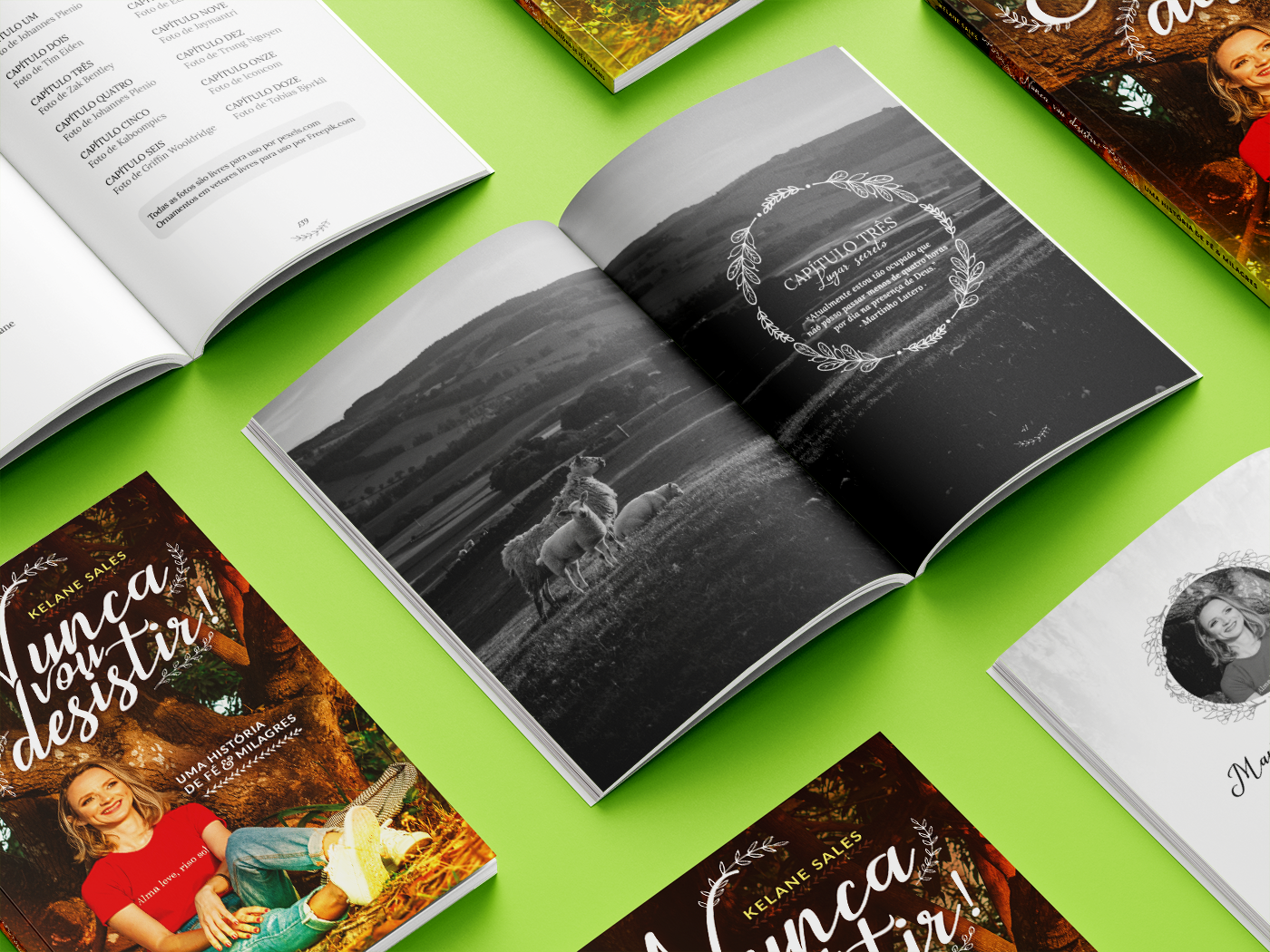 Um dos projetos mais lindos que tive a oportunidade de participar, foi para o livro "Nunca vou desistir" da Kelane Sales. É um daqueles livros que testa sua Fé! Você vai ler e se surpreender. Neste projeto fiz a capa e o projeto gráfico e para a diagramação contei com a ajuda da Tainá D'Amico, obrigada querida! A identidade quem pensou foi a própria Kelane Sales. O livro todo tem a temática de natureza, árvore, criar raízes! E sou apaixonada pelo design dele, por que foi a autora que escolheu tudo, e também por que ficou muito lindo, harmonizou super bem. É um livro que me aqueceu o coração. Mais páginas deste rico projeto você pode conferir no portfólio no Behance.